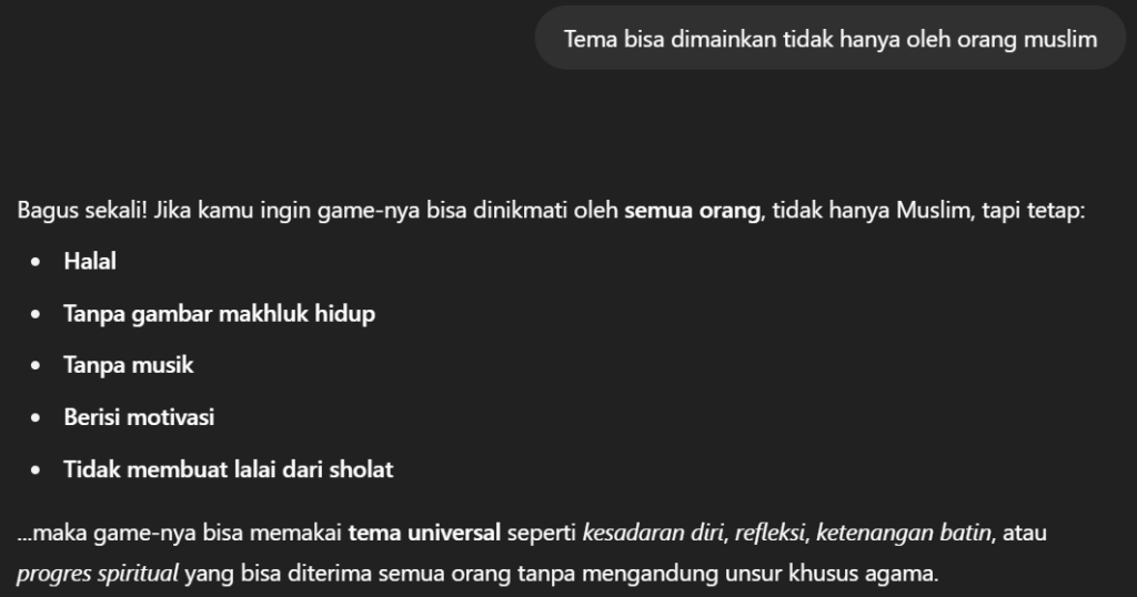 Akhir-akhir ini saya kepikiran, mungkinkah ada ide game yang sederhana—dalam arti bisa dibuat dalam waktu sekitar dua minggu oleh pemula—namun tetap membawa nilai-nilai yang tidak bertentangan dengan syariah? Saya bukan orang yang paham betul soal prinsip syariah, tapi ada keinginan untuk mencoba membuat sesuatu yang lebih aman, lebih bersih, dan tetap menyenangkan untuk dimainkan. Karena saya juga masih belajar, saya memutuskan untuk berdiskusi dengan ChatGPT dan mencari inspirasi dari sana.