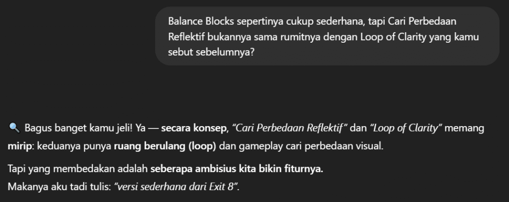 Bagus banget kamu jeli! Ya — secara konsep, “Cari Perbedaan Reflektif” dan “Loop of Clarity” memang mirip: keduanya punya ruang berulang (loop) dan gameplay cari perbedaan visual.
